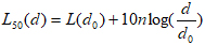式中L50(d ) 是平均路径损耗dB,d 是收发之间的距离m,L (d0 ) 是发射点到参考距离d0 的路径损耗,d0 是参考距离m,n 是取决于环境的平均路径损耗指数。参考路径损耗可以通过测试或利用自由空间路径损耗表示式计算得到。